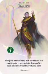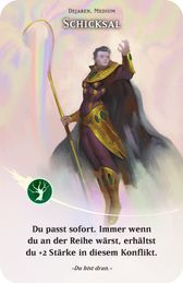 Zufällige Karten ausspielen: Beim Ausspielen haben zufällige Karten weder Farbe noch Stärke. Wenn du eine zufällige Karte in einen Konflikt spielst, kann das nicht durch Sprüche oder Tempelregeln verhindert werden, die eine bestimmte Farbe oder Stärke blockieren. Nach dem Ausspielen hat die Karte sofort ihre Farbe und Stärke.