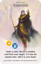 Name a color. Reveal a random card from your supply. If it has the named color, add it to your hand.