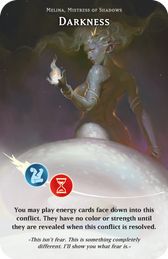 You may play energy cards face down into this conflict. They have no color or strength until they are revealed when this conflict is resolved.