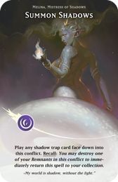 Rückruf: "Du darfst eine eigene Erinnerung in diesem Konflikt zerstören, um den Spruch zurück in deine Spruchsammlung zu nehmen." Du kannst den Spruch also in der laufenden Runde noch einmal ausspielen, solange die Bedingung erneut bzw. immer noch erfüllt ist.