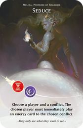 Choose a player and a conflict. The chosen player must immediately play an energy card to the chosen conflict.